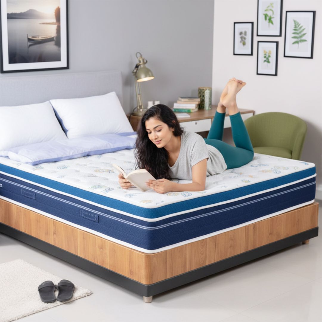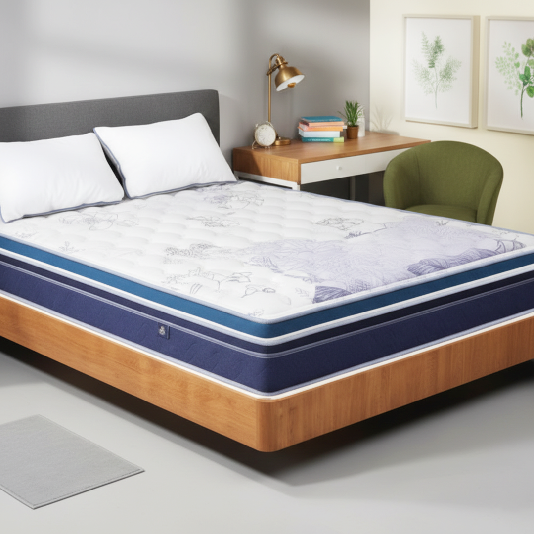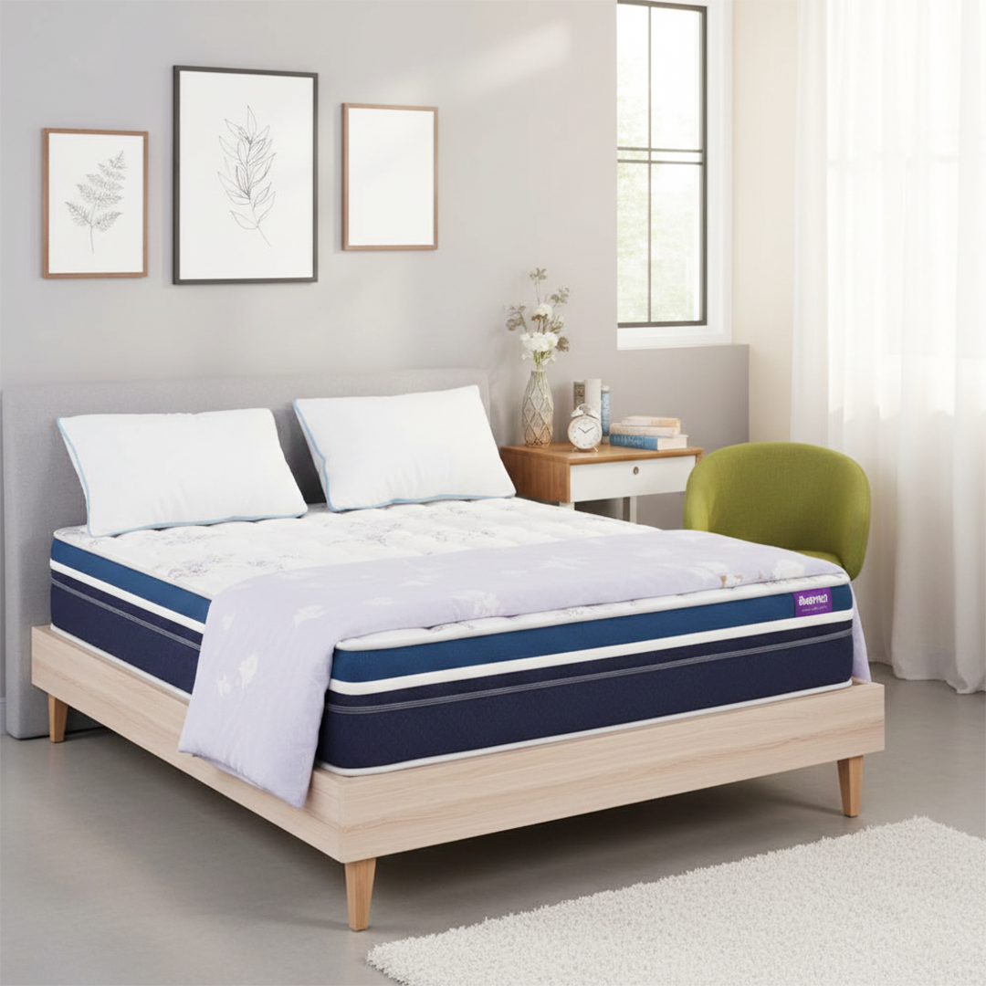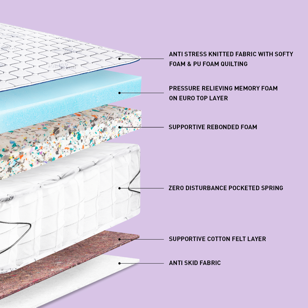 ANTI STRESS KNITTED FABRIC, BODY SUPPORTIVE HIGH-DENSITY MEMORY FOAM, ZERO DISTURBANCE POCKETED SPRING, PRESSURE RELIEVING MEMORY FOAM