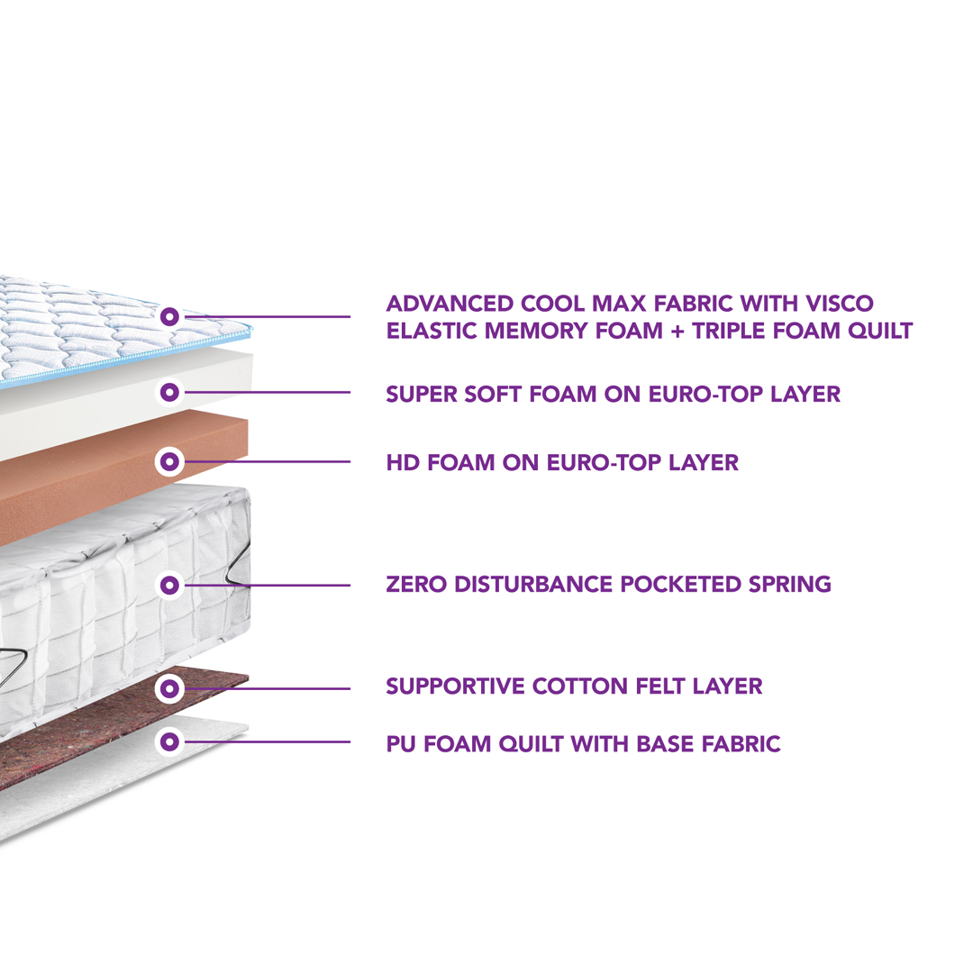 Supersoft foam on Euro top layer, high-density foam on Euro top layer, zero-disturbance pocketed spring, supportive cotton felt layer, PU foam quilted base fabric