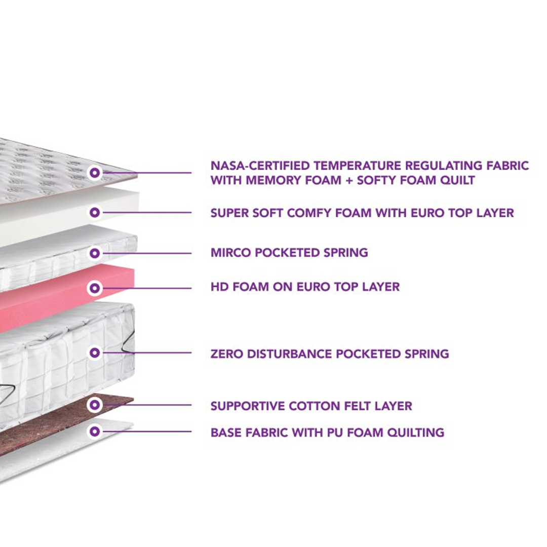 Super soft comfy foam with Euro top layer, micro pocketed springs, high-density foam on Euro top, zero-disturbance carbonated steel pocket spring unit, supportive cotton felt layer, base fabric with pu foam quilting