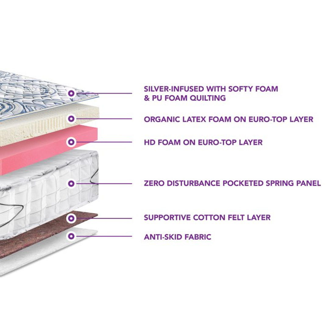 Silver-infused knitted fabric, organic breathable latex foam, zero-disturbance pocketed spring support