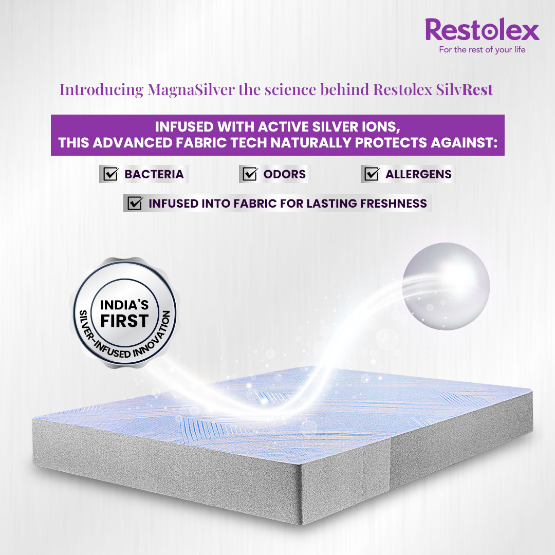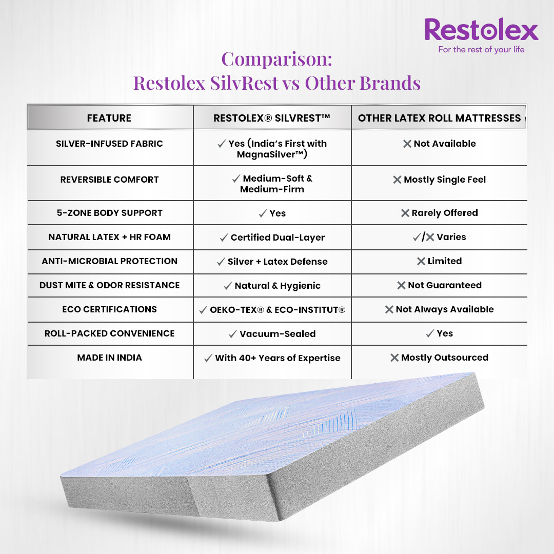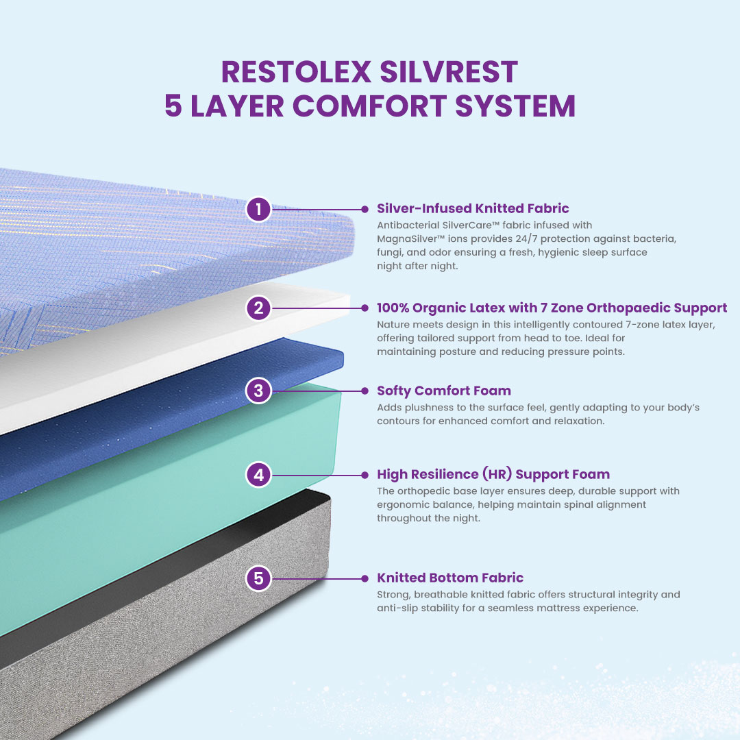 Restolex® SilvRest™ features MagnaSilver™ silver-ion technology infused into the fabric to actively resist bacteria, allergens, and odors for a cleaner sleep surface. Crafted with 100% organic latex and 7-zone orthopaedic support, it delivers responsive comfort, pressure relief, and healthy spinal alignment. Vacuum-packed and roll-packed for convenience, this eco-conscious 6-inch mattress offers protected, hygienic rest with lasting freshness and ease of use.