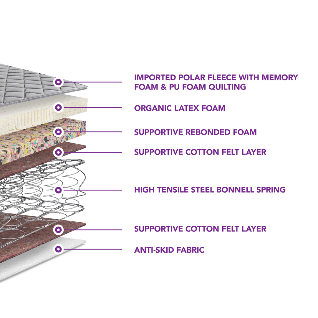 Soft-touch fabric, high-tensile steel bonnel spring, organic breathable latex foam, pressure-relieving memory foam