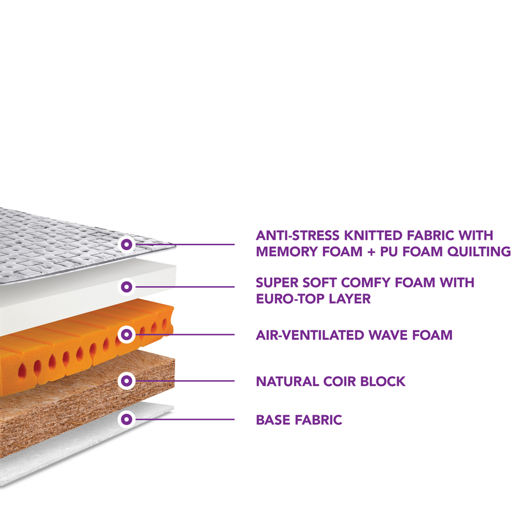 ANTI STRESS KNITTED FABRIC, NATURAL COIR BLOCK, PRESSURE RELIEVING MEMORY FOAM, AIR-VENTILATED WAVE FOAM